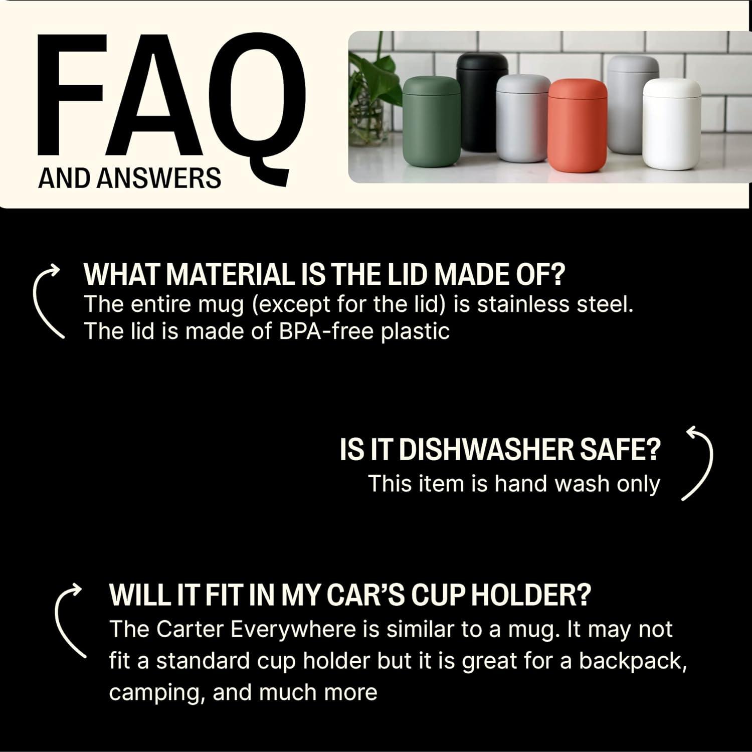 DISHWASHER SAFE: Spend less time washing your travel tumbler by hand. Simply pop your Carter and lid into the dishwasher to get them clean. The interior ceramic coating will come out clean.