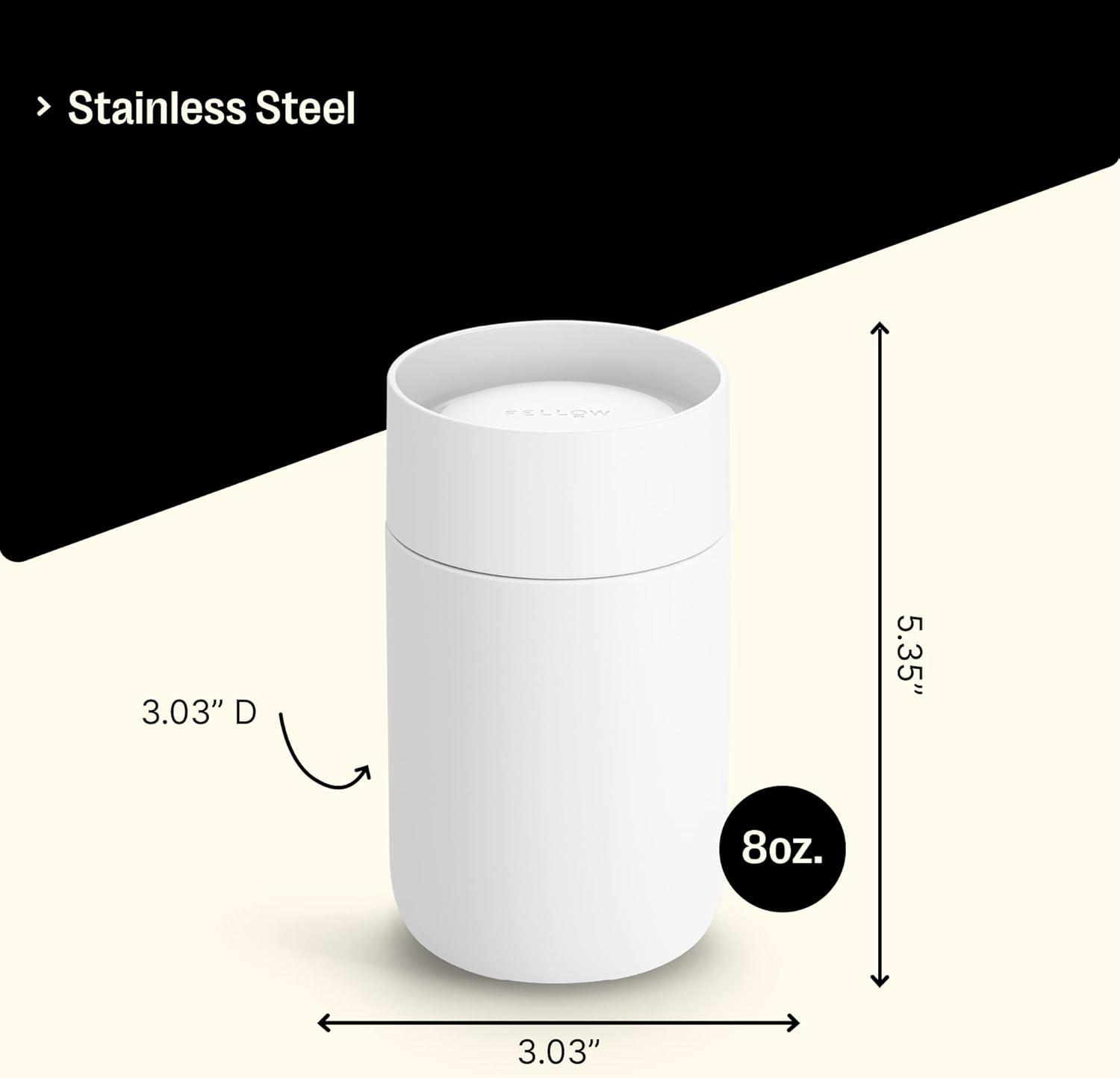 Fellow Carter Move Mug with 360º Sip Lid - Open Top Coffee To-Go Tumbler with Ceramic Interior, Vacuum-Insulated Stainless Steel, Matte White, 8 oz Cup(Matte White)