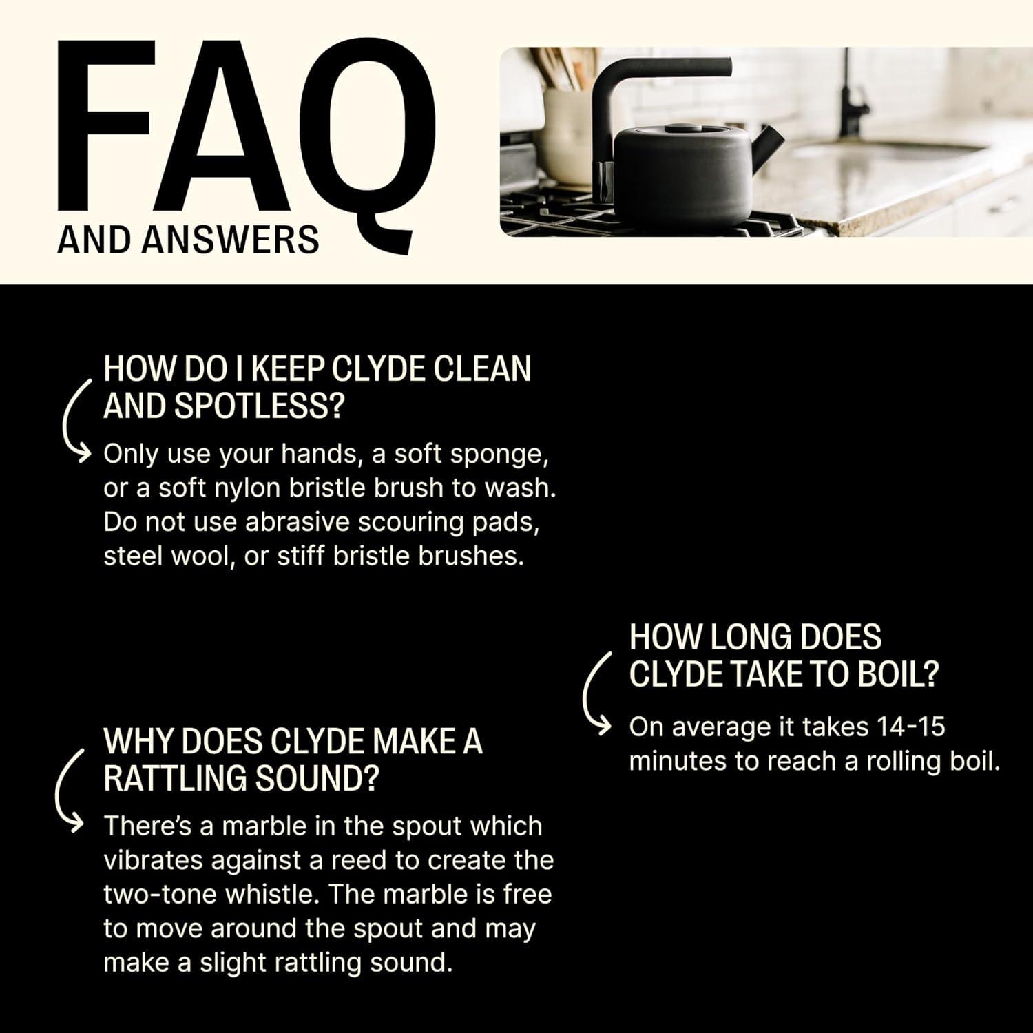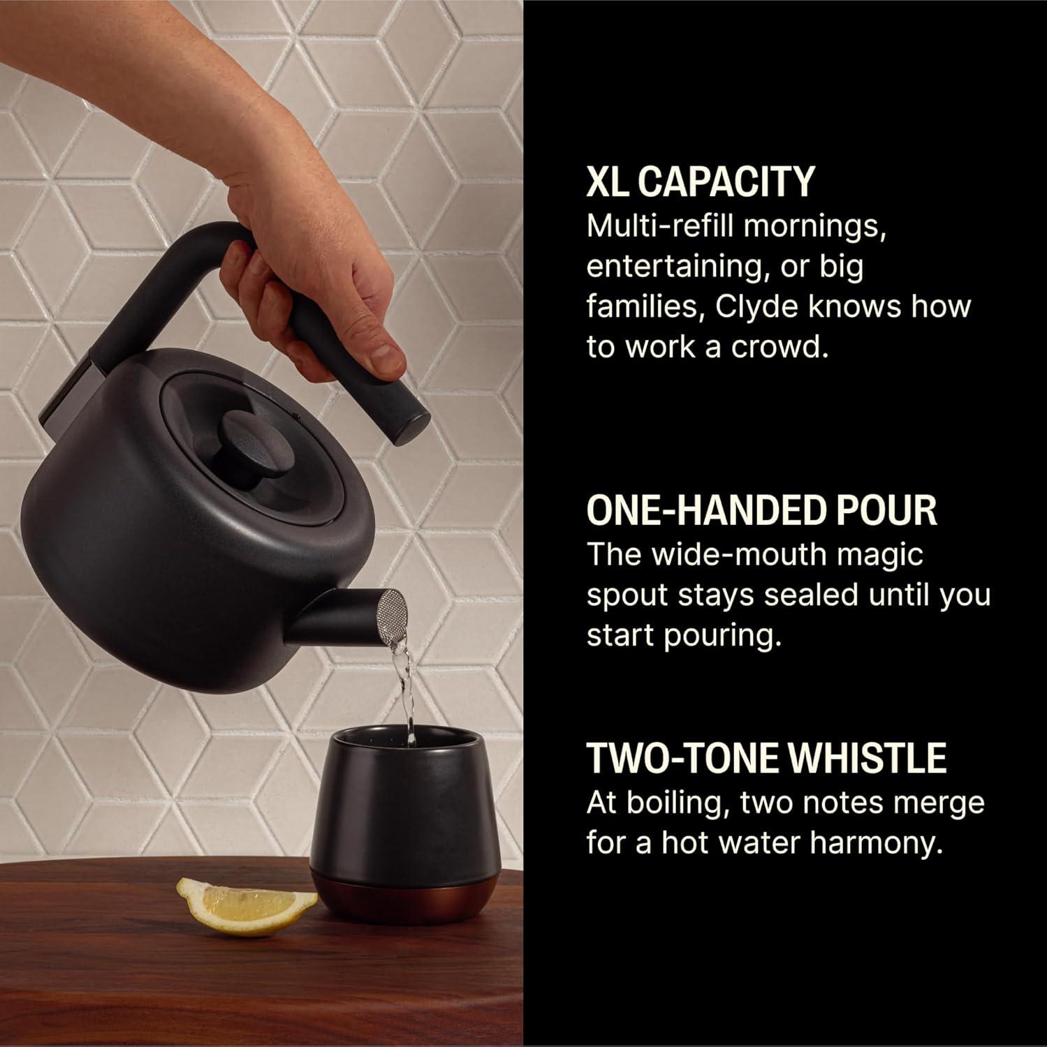 WHISTLING TEA KETTLE – Clyde's been trained to sing a two-toned harmonic whistle alerting you that your water is boiling hot and ready to steep your tea or craft your brewed french press or pour-over coffee