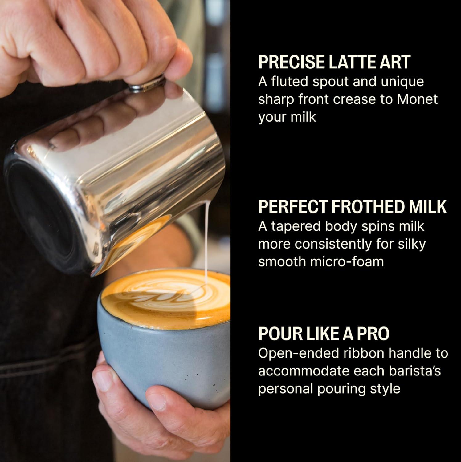EDDY STEAMING PITCHER – The barista's paintbrush for pouring precise latte art; The fluted spout, unique sharp front crease, and tapered body work in tandem to Monet your milk